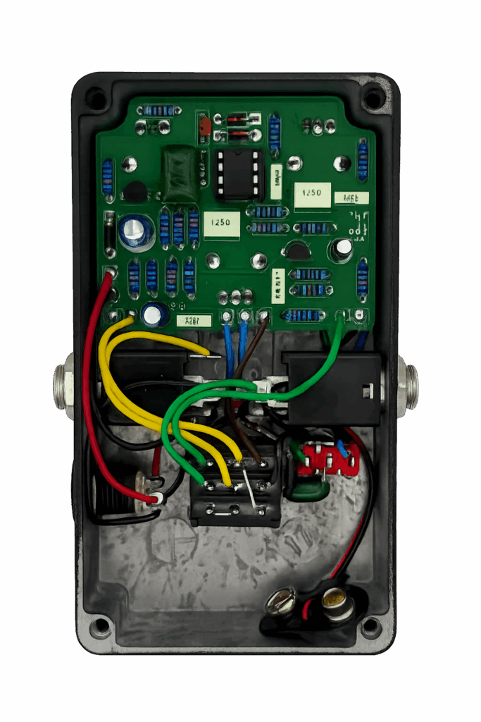 The Overdrive+ is housed in a Hammond enclosure and built with Switchcraft jacks, Alpha potentiometers and footswitch, and 24 AWG AlphaWire for all internal wiring.